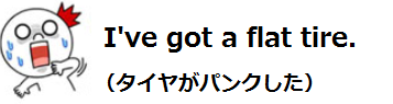 2018-07-05 英語で『タイヤがパンクした』は。。。 英語で『タイヤがパンクした』は、 『 I've got a flat tire. 』 タイヤがパンクするなんて災難、 出来ればなりたくないですが、 何か乗り物に乗っていると、 嫌でも経験しますからね。。。(´;ω;`)ウゥゥ いつかのために、 このフレーズを覚えておこうと思います!
